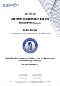 Ich, Detlev Berger, habe im Oktober 2025 meine Weiterbildung zum geprüften Immobilienschaden-Experten an der Sprengnetter Akademie erfolgreich beendet.
